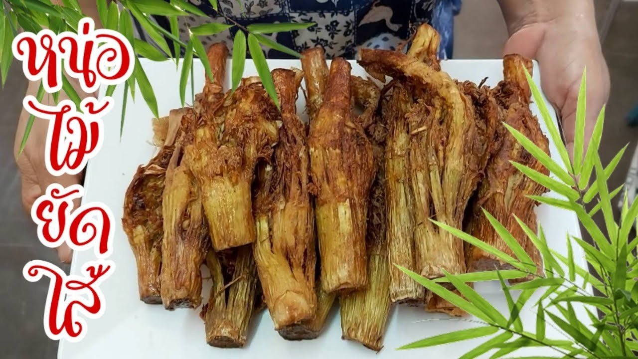 6. ตั้งกะทะให้ไฟร้อนแล้วนำหน่อไม้ที่ยัดไส้แล้วลงทอดจนเหลืองและสุก ใช้ไฟปานกลาง