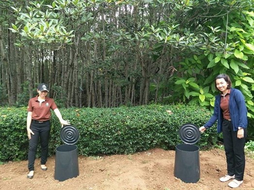 3. นำถังหมักรักษ์โลกที่ทำการประกอบเสร็จเรียบร้อยวางลงไปกลางหลุมที่ขุดไว้ และกลบด้วยดินที่ขุดขึ้นมา โดยการกลบจะต้องกลบแบบหลวมๆ ไม่อัดดินให้แน่น