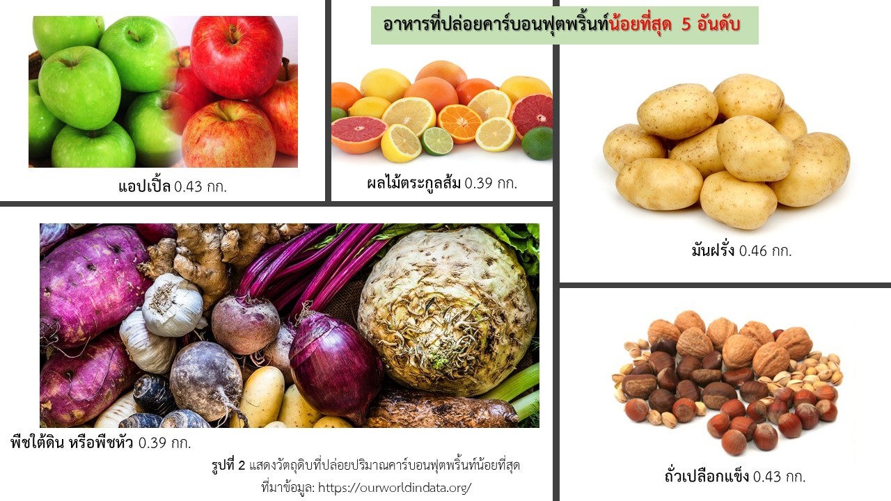 ข้อมูลของ Our World in Data ได้จัดอันดับของวัตถุดิบที่ปล่อยคาร์บอนบอนฟุตพริ้นท์มากที่สุด 10 อันดับแรกของโลก เนื่องจาก “การผลิตเนื้อ’ ไม่ว่าจะเป็นเนื้อแดง เนื้อขาว หรืออาหารทะเล และการผลิตอาหารจากสัตว์ เช่น ชีส ล้วนแต่เป็นกิจกรรมที่สร้างคาร์บอนฟุตพริ้นท์ในปริมาณมาก และเนื้อที่ครองอันดับหนึ่งก็คือ เนื้อวัว ที่สร้างคาร์บอนฟุตพริ้นท์สูงกว่าวัตถุดิบอย่างอื่นหลายเท่าตัว ในขณะที่เนื้อที่เป็นมิตรกับโลกที่สุดก็คือ เนื้อไก่ และอาหารที่สร้างคาร์บอนฟุตพริ้นท์น้อยที่สุด คือ อาหารจำพวกพืช ไม่ว่าจะเป็นผัก ผลไม้ ธัญพืช พรือพืชจำพวกถั่วต่าง ๆ เพราะการผลิตวัตถุดิบเหล่านี้ใช้พื้นที่ พลังงาน น้ำ และทรัพยากรน้อยกว่าเนื้อสัตว์ ดังนั้น Our World in Data ได้จัดอันดับอาหารที่สร้างคาร์บอนฟุตพริ้นท์น้อยที่สุด 5 อันดับ โดยคิดจากปริมาณคาร์บอนฟุตพริ้นท์ที่ถูกปล่อยเข้าชั้นบรรยากาศต่อการผลิตวัตถุดิบ 1 กก. แสดงตามรูปที่ 1 และ 2