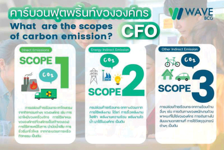 1. คาร์บอนฟุตพริ้นท์องค์กร (CFO) หมายถึง ปริมาณก๊าซเรือนกระจกที่ปล่อยออกมาจากกิจกรรมของ องค์กร ตั้งแต่การใช้เชื้อเพลิง การใช้ไฟฟ้า การขนส่ง ไปจนถึง การจัดการของเสีย โดยพิจารณาจาก 3 ส่วนหลัก ที่เราเรียก จนชินว่า สโคป (Scope) ดังนี้ (โปรดดูภาพประกอบเพื่อความ เข้าใจมากยิ่งขึ้น)